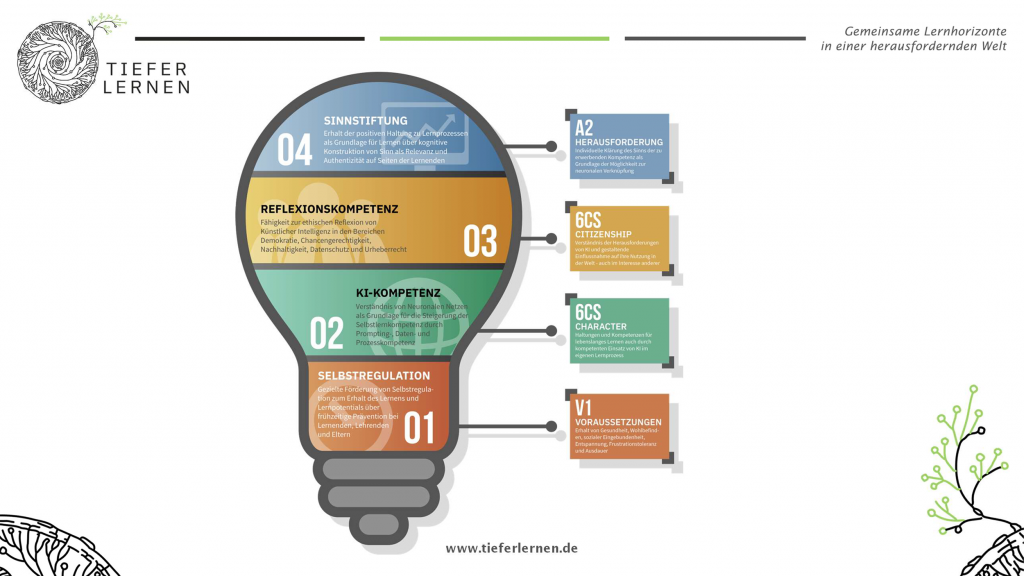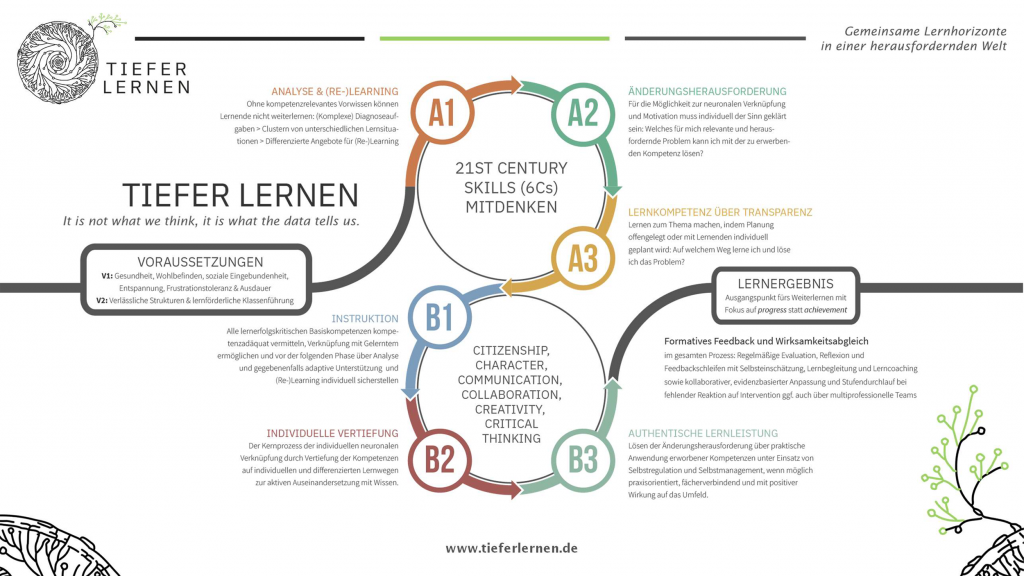 Tiefer Lernen kann sowohl eine Grundlage für die Konzeption von Lernprozessen in der Schule und im lebenslangen Lernen sein, als auch strukturierte Impulse für die Weiterentwicklung von Schulen und die sie umgebenden Systeme bieten, weil es klare Prioritäten für bessere Lernprozesse in herausfordernden Zeiten setzt. Der Einzug großer Sprachmodelle in den Alltag der Menschen verändert dabei potentiell das Spielfeld, macht Veränderungen notwendiger denn je und kann bei systematischer Integration gleichzeitig wertvolle Unterstützung bieten.